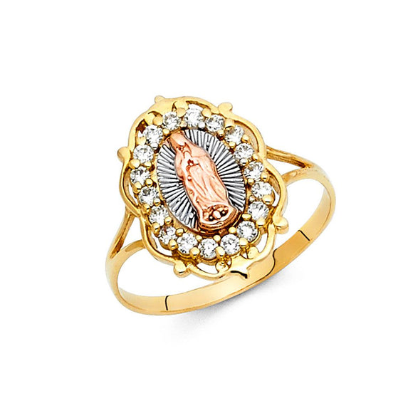 14K Tri Color Gold CZ Virgen Mary Ring w/ Flowers